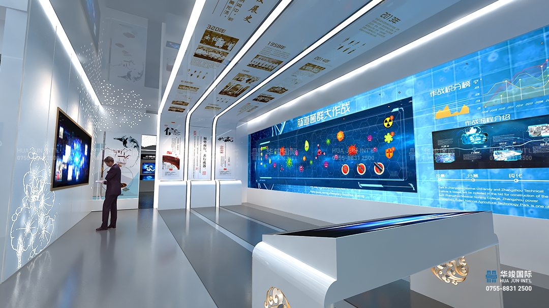 來到腸道菌群區(qū)域,頂部世界腸道菌群發(fā)展史一路向前,地圖可以實(shí)時(shí)更新世界是每個(gè)地域最新的醫(yī)學(xué)研究成果與醫(yī)療模式,參觀者可以通過互動平臺,詳細(xì)了解鴻慈的臨床案例,主動的與數(shù)字地圖產(chǎn)生交互,了解自己感興趣的最新醫(yī)學(xué)信息。