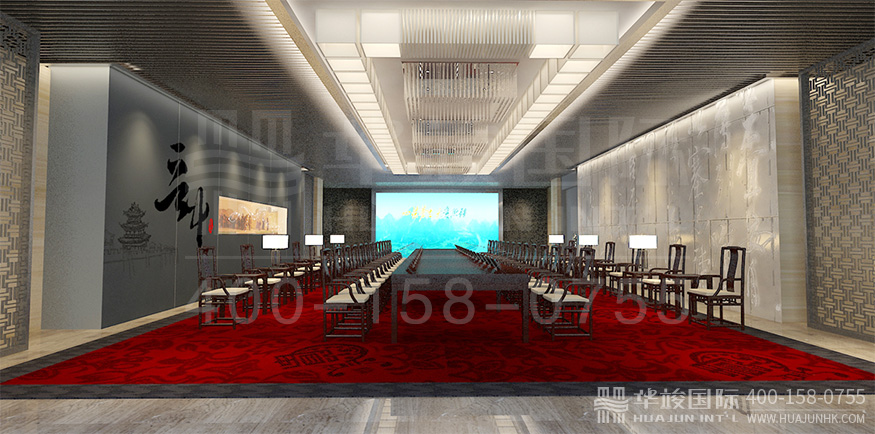 序廳頂部,采用LED矩陣燈組合成文字,以科技新穎的方式呈現(xiàn)公司主題理念。背景墻下以高低錯落的LED屏,滾動播放集團(tuán)文化。整個序廳虛實結(jié)合,古今交融,四圍采用傳統(tǒng)中式風(fēng)格,天地融合現(xiàn)代科技手段,整體格局相輔相成,渾然一體。