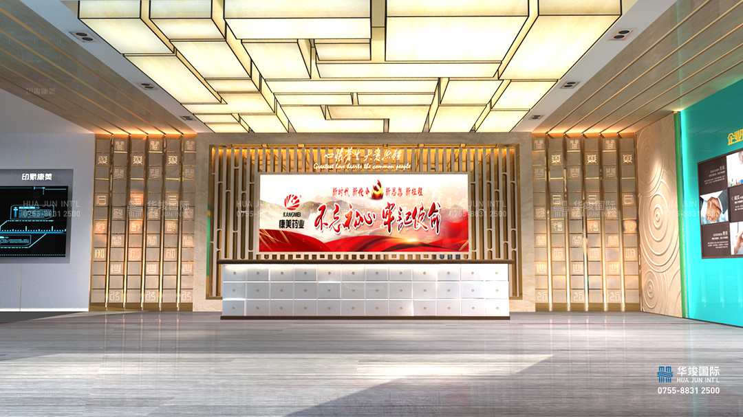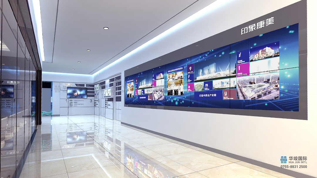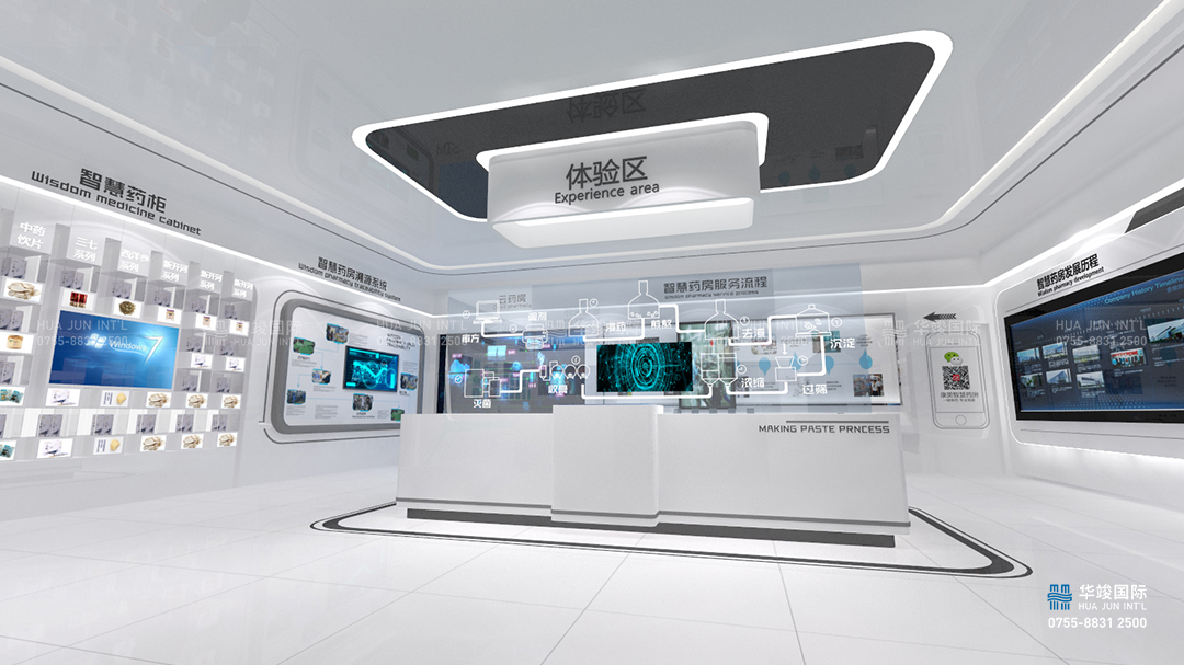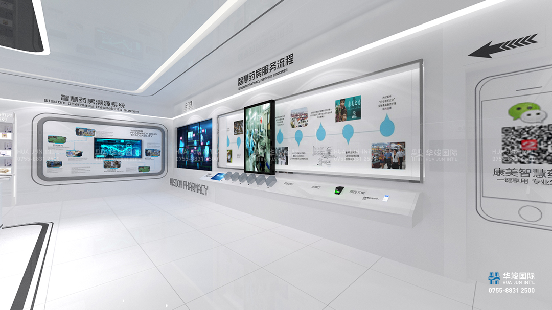 寶安康美智慧醫藥展館設計項目由華竣國際執行整體設計施工,華竣數創擁有頂級展館設計團隊和國際化的創新設計理念,融合互聯網+思維,順應科技化趨勢,打造全新智慧多媒體展廳。