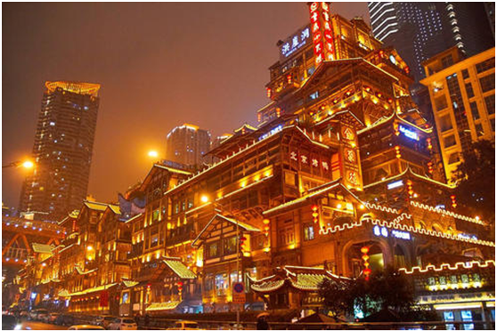 洪崖洞建筑群依山而建、沿江而立。載體本身用分層筑臺、吊腳、層疊等手法,搭建出一個極具立體感和層次感的建筑載體,配合江水、跨江大橋、現代化高樓的應襯,為景觀照明設計創造出絕無僅有的優質先決條件,這樣的載重在體放大建筑本身的結構美。現在的洪崖洞正是采用燈帶結合的方式,將燈光重點運用在廊柱投射和輪廓勾勒上,墻身處使用泛光燈照亮整個樓宇外墻,輔助突出建筑輪廓。
