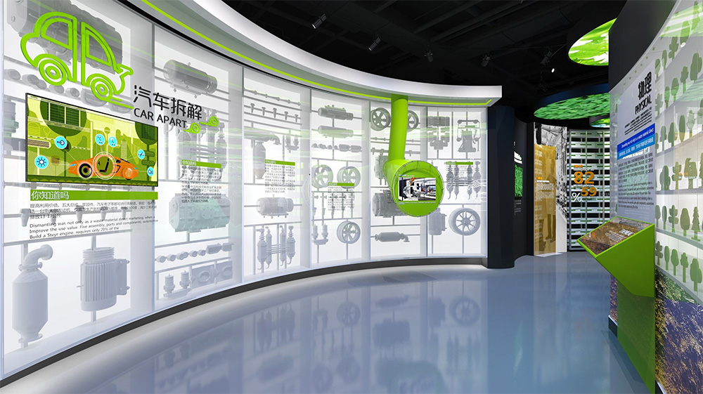 展館內容和展示分區規劃上,除了做一些基礎的圖文科普知識外,還可以設置一些實物展示區,將一些可以重復利用的垃圾變廢為寶,展館內的面積有限,所以不是所有展館都可以做到參觀和垃圾分揀流水線展現在同一個空間,這就需要設置一些多媒體展示區,通過高科技展示手段實現這方面需求。