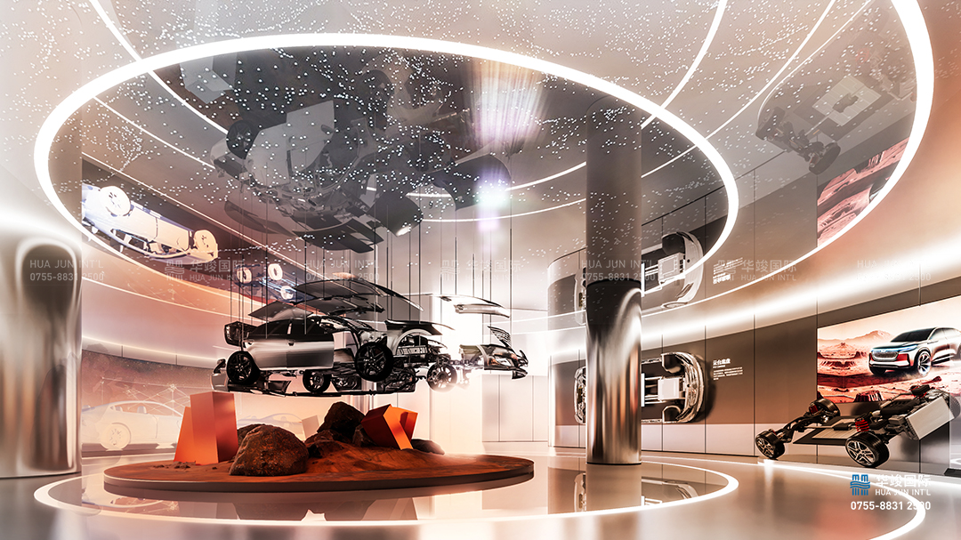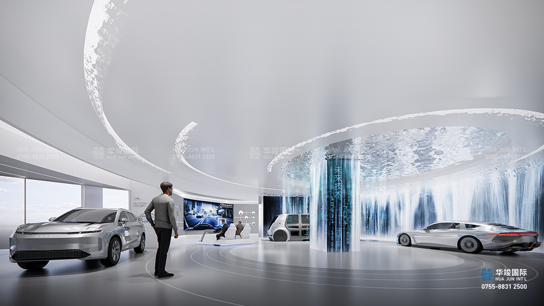 未來技術板塊作為新能源汽車展廳中的創(chuàng)新展示區(qū)域,重點展示未來汽車領域的核心技術與顛覆性創(chuàng)新產(chǎn)品,探索新能源、智能化和未來出行方式的無限可能。在這個區(qū)域,通過環(huán)屏營造出未來世界的想象空間,通過多樣化的技術展示和互動體驗,讓觀眾感受未來汽車的科技魅力與生活方式的全新定義。